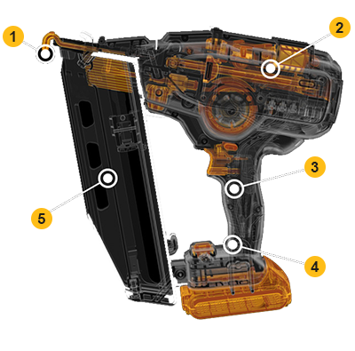 Kulløs bæltefri motor og svinghjul forbedrer ydelsen. DCN660 kan affyre ca. 800 dykkere med et 2Ah batteri og 2200 dykkere med et 5Ah batteri